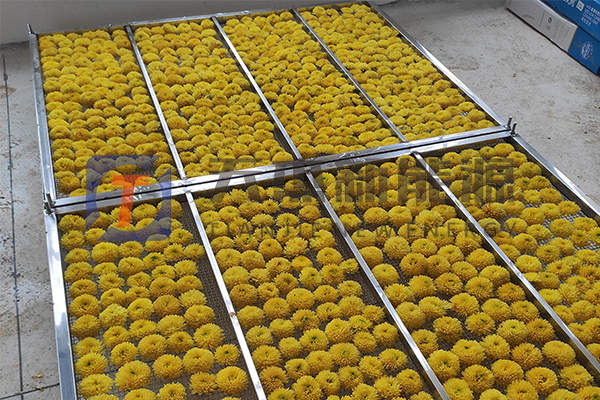 裝房過程中:將采摘好的菊花進(jìn)行挑揀,選擇花型一致,顏色統(tǒng)一的鮮菊花,均勻擺放在托盤上,如果對(duì)花型有要求嚴(yán)格的話,則建議在擺放時(shí)不要重疊,隨后放置在推車上,推進(jìn)菊花烘干機(jī)內(nèi)。