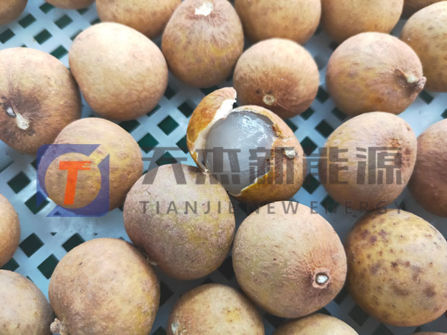 初烘:將龍眼均勻的攤放到龍眼桂圓烘干機(jī)推車上,初始溫度設(shè)定為55℃,烘干時(shí)間為8個(gè)小時(shí)左右,初烘完成的成品是外殼堅(jiān)硬,果肉呈黃褐色或赤褐色并帶油光,有細(xì)小皺紋,果核外皮易脫落,核仁淡白色。