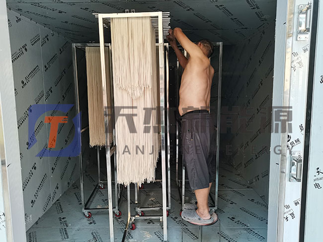 ③保住濕出汗階段:此階段后,面條內(nèi)部溫度升高,內(nèi)部水分轉(zhuǎn)移與表面汽化基本平衡,因此空氣能掛面烘干機(jī)此時可升高溫度、下降濕度,保證水分的大量除去。此階段溫度為 45~50t,相對濕度 55%一 60%,時間為90分鐘,水分由25%下降到16%一17%。