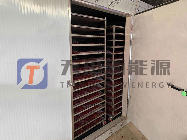 黑龍江五味子烘干機客戶現(xiàn)場成品預覽:將準備烘干的五味子平鋪在烘盤中推入五味子烘干機