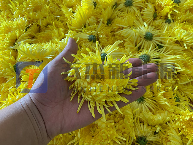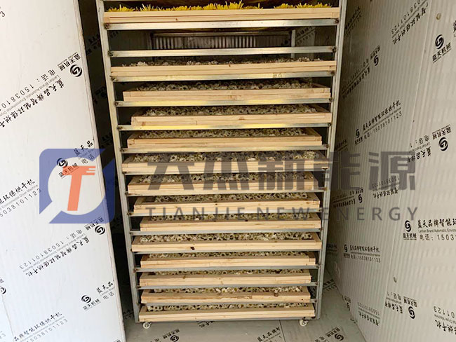 將挑選好的金絲皇菊均勻的鋪在烘盤中推入信陽金絲皇菊烘干機(jī)內(nèi)準(zhǔn)備烘干