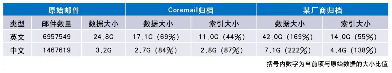 且經(jīng)過測試發(fā)現(xiàn),將相同的郵件數(shù)據(jù)導入歸檔系統(tǒng),Coremail郵件歸檔模塊通過CRC去重和分塊壓縮技術,有效降低了郵件數(shù)據(jù)占用空間。而導入某廠商歸檔產(chǎn)品后,存儲占用相比原始數(shù)據(jù)均進行了放大,整體占用甚至達到了Coremail歸檔的兩倍以上,很大程度上浪費了存儲空間,更進一步提高了其按容量結算的價格。