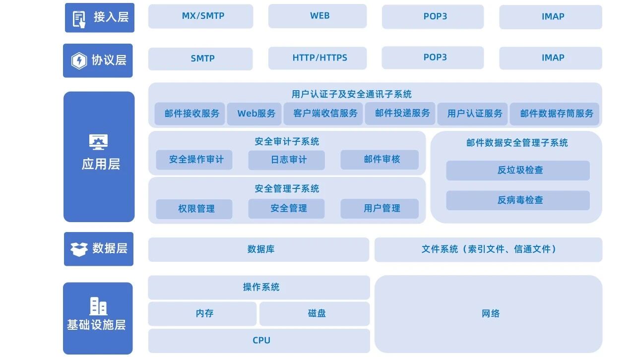 Coremail郵件系統歷時26年,把不同的功能模塊化,最大程度地減少系統的數據冗余,增強系統的穩(wěn)定性和運作性。系統采用分布式部署架構,最大地避免系統宕機,同時系統可保持高拓展性。