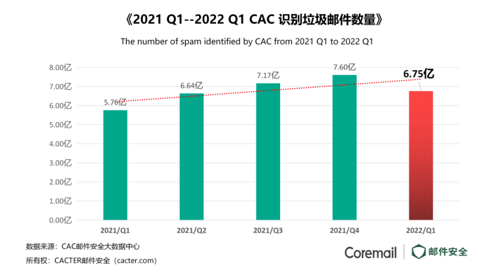根據(jù)CAC郵件安全大數(shù)據(jù)中心評(píng)估,2022 Q1全國企業(yè)郵箱用戶共收到各類垃圾郵件6.75億封,相比2021年Q4季度環(huán)比下降11.5%,但對比去年Q1同比增長17.28%。