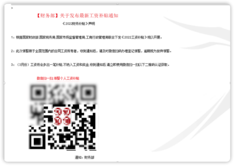 該封郵件正文是工資補(bǔ)貼通知,在正文中放置了一張二維碼圖片,誘導(dǎo)收件人掃描正文中二維碼。郵件附件的內(nèi)容和郵件正文一樣,并未攜帶病毒和可執(zhí)行文件。