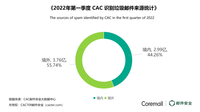 根據(jù)Coremail監(jiān)測,垃圾郵件的發(fā)送者遍布全球。其中,來自境外的垃圾郵件占企業(yè)用戶收到的垃圾郵件的55.74%,向全球發(fā)送了3.76億封垃圾郵件;境內(nèi)發(fā)送占比44.2%,向全球發(fā)送了2.99億封垃圾郵件。