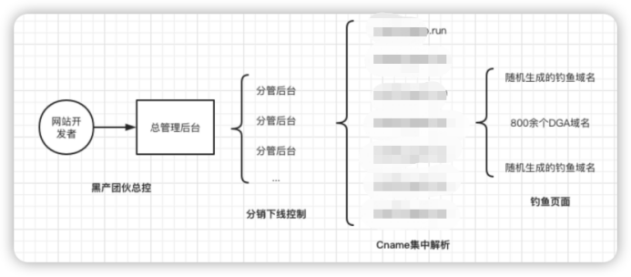 通過對黑產(chǎn)業(yè)務(wù)的摸排,還原出黑產(chǎn)團(tuán)隊(duì)的組織架構(gòu)。由主團(tuán)伙負(fù)責(zé)開發(fā)和維護(hù)建站模版,使用寶塔統(tǒng)一部署。在找到分銷的下線之后,為下線部署一個(gè)管理后臺(tái),然后將一個(gè)隨機(jī)生成的域名綁定到釣魚服務(wù)器上。