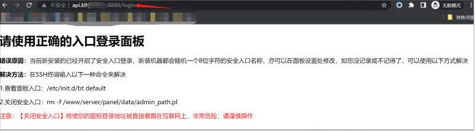 對此域名進(jìn)行端口掃描,發(fā)現(xiàn)開啟8888端口,訪問該端口為發(fā)現(xiàn)寶塔登錄面板,由此可得出此釣魚為寶塔統(tǒng)一部署,從正面滲透進(jìn)入寶塔難度極高。