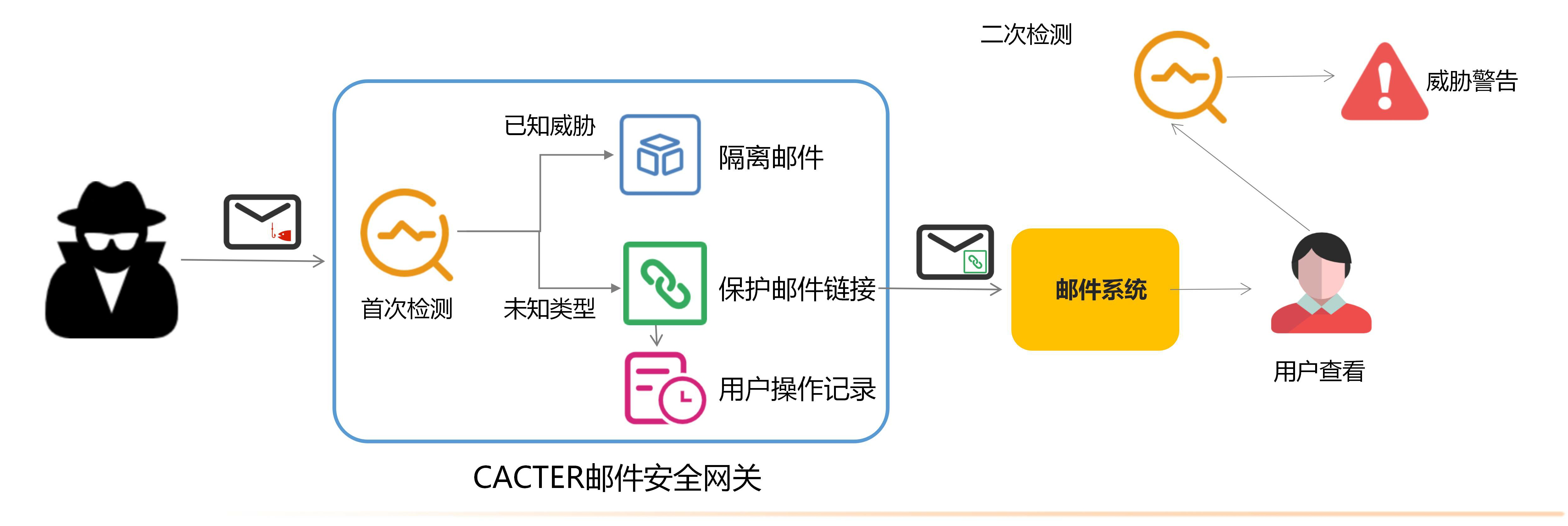 使用CACTER郵件網(wǎng)關(guān)后,管理員可開啟惡意鏈接保護(hù)功能,對投往郵件系統(tǒng)的每一封郵件的鏈接進(jìn)行保護(hù)。首次過濾+二次檢測防護(hù),事前攔截、事中提醒、事后追溯結(jié)合,為郵件系統(tǒng)的郵件安全保駕護(hù)航。