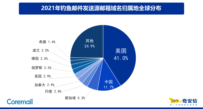 《報告》顯示,2021年,全國企業(yè)郵箱用戶共收到各類釣魚郵件約342.2億封,其中境外釣魚郵件攻擊占比約88.3%,而來自美國的釣魚郵件最多,占國內企業(yè)用戶收到的釣魚郵件的41.0%。