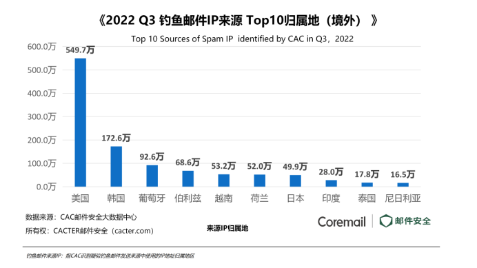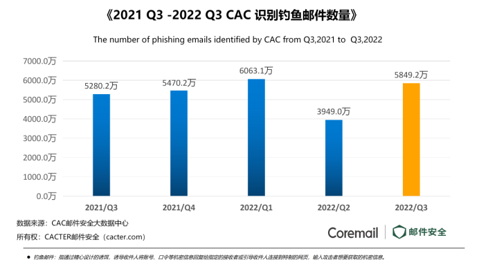 對(duì)比“Q2 CAC 識(shí)別釣魚郵件數(shù)量”,Q3釣魚郵件攀升至5849.2萬,環(huán)比上升 48.12%,同比上升10.78%。