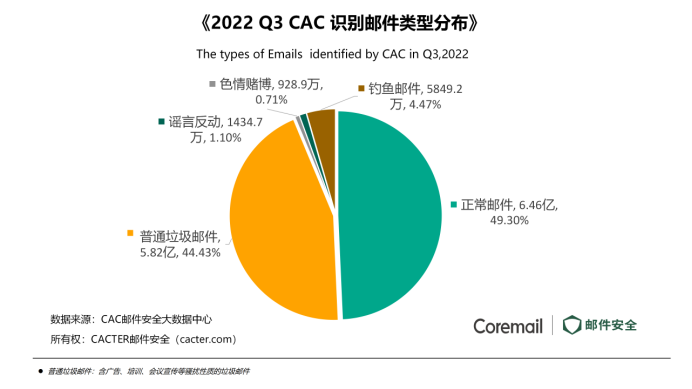根據(jù)CAC中心研究發(fā)現(xiàn),全國企業(yè)郵箱用戶在2022第三季度年共收發(fā)正常郵件6.46億封,占比49.3%。