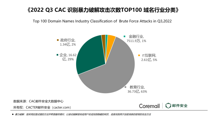 據(jù)分析,Q3 TOP 100 域名中,無論是接收釣魚郵件數(shù)量、接收垃圾郵件數(shù)量、被暴力破解攻擊次數(shù),均為教育行業(yè)遭受的威脅最大。
