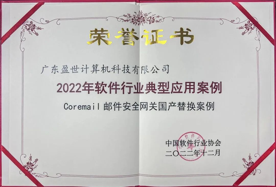 當(dāng)日,活動(dòng)現(xiàn)場(chǎng)公布了2022年軟件行業(yè)典型應(yīng)用案例,由廣東盈世計(jì)算機(jī)科技有限公司申報(bào)的Coremail信創(chuàng)電子郵件系統(tǒng)解決方案和Coremail郵件安全網(wǎng)關(guān)國(guó)產(chǎn)替換案例兩個(gè)方案成功入選。