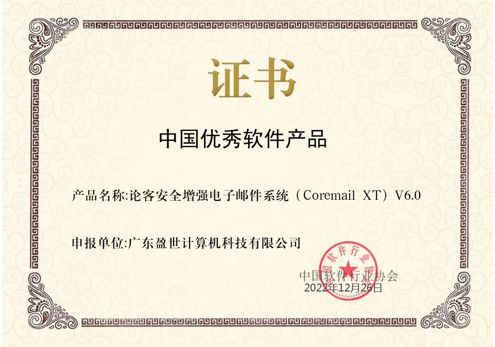 中國優(yōu)秀軟件產(chǎn)品評選由中國軟件行業(yè)協(xié)會主辦,旨在發(fā)掘并推介優(yōu)秀軟件產(chǎn)品,培育著名軟件品牌,為政府采購和大型信息化工程招標項目提供參考,由多位行業(yè)專家對全國的參評軟件進行評選得出。2022年12月,Coremail XT6郵件系統(tǒng)經(jīng)過多輪審核評估,最終入選。