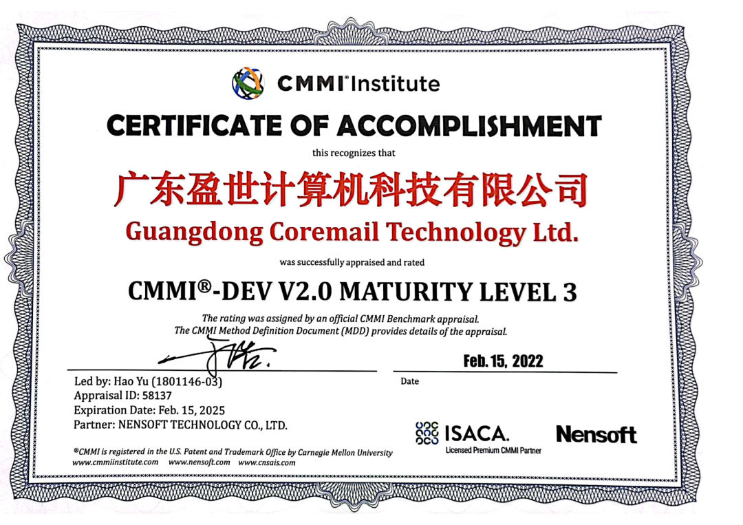 2022年2月,廣東盈世計算機科技有限公司被授予CMMI 3級證書。CMMI全稱為Capability Maturity Model Integration,即軟件能力成熟度模型集成,是國際公認的衡量軟件企業(yè)業(yè)務(wù)能力成熟度和項目管理水平的權(quán)威標準,主要用于指導軟件開發(fā)過程的改進和進行軟件開發(fā)能力的評估,是目前全球范圍內(nèi)軟件領(lǐng)域難度最大、規(guī)格最高、最權(quán)威的認證之一。