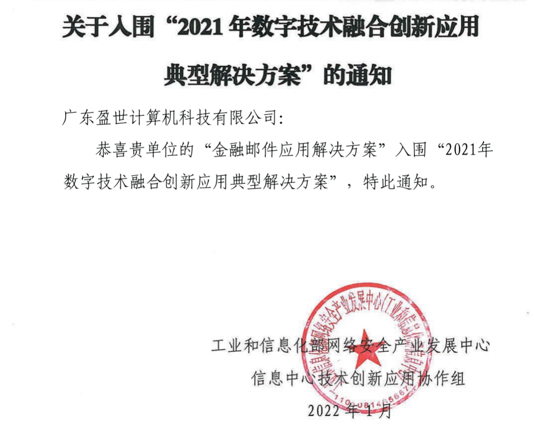 2022年1月,Coremail金融郵件應(yīng)用解決方案成功入圍由工業(yè)和信息化部網(wǎng)絡(luò)安全產(chǎn)業(yè)發(fā)展中心(工業(yè)和信息化部信息中心)、信息中心技術(shù)創(chuàng)新應(yīng)用協(xié)作組主辦的“2021年數(shù)字技術(shù)融合創(chuàng)新應(yīng)用典型解決方案”