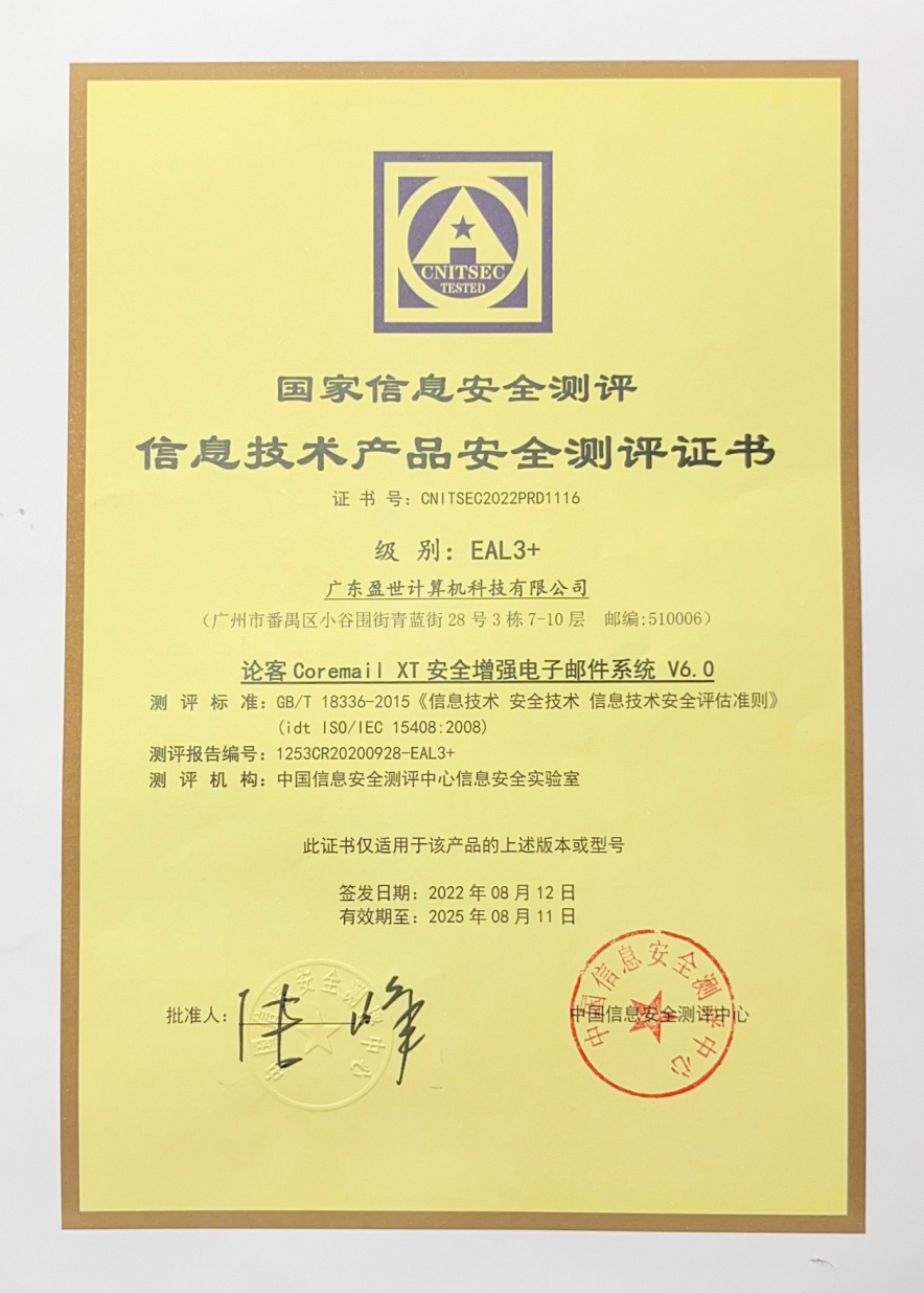 2022年8月,經(jīng)過嚴格的信息安全評估,Coremail XT6郵件系統(tǒng)成功獲得《信息技術(shù)產(chǎn)品安全測評證書》EAL3+級認證。該認證是國家信息安全測評中心依據(jù)國家標準 GB/T 18336—2015《信息技術(shù) 安全技術(shù) 信息技術(shù)安全評估準則》從安全目標、開發(fā)、指導性文檔、生命周期支持、測試和脆弱性評定等多個方面全面評估。
