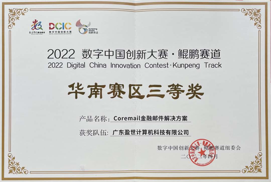 7月15日下午,2022數(shù)字中國創(chuàng)新大賽·鯤鵬賽道華南賽區(qū)頒獎典禮順利舉行,廣東盈世從眾多隊伍中脫穎而出,憑借著Coremail金融郵件解決方案自主可控的技術(shù)實踐和開放靈活的系統(tǒng)應(yīng)用榮獲華南賽區(qū)三等獎。
