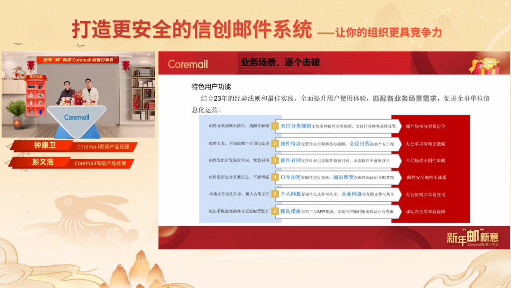 鐘康衛(wèi)和彭文浩兩位Coremail資深產(chǎn)品經(jīng)理全面介紹了Coremail信創(chuàng)郵件系統(tǒng)。Coremail結(jié)合23年的經(jīng)驗(yàn)法則和最佳實(shí)踐,全面提升用戶使用體驗(yàn),匹配各業(yè)務(wù)場景需求,促進(jìn)企事單位信息化運(yùn)營。自研多活高可用與郵件系統(tǒng)深度兼容,秒級(jí)切換保證業(yè)務(wù)無中斷。提供SDK接口開發(fā)方案和API接口集成方案,最大化滿足客戶高度集成定制需求。在2022年,Coremail結(jié)合客戶切身需求,更新升級(jí)了編輯器、日程、通訊錄、二次驗(yàn)證等等功能,為客戶提供更優(yōu)質(zhì)的使用體驗(yàn)。