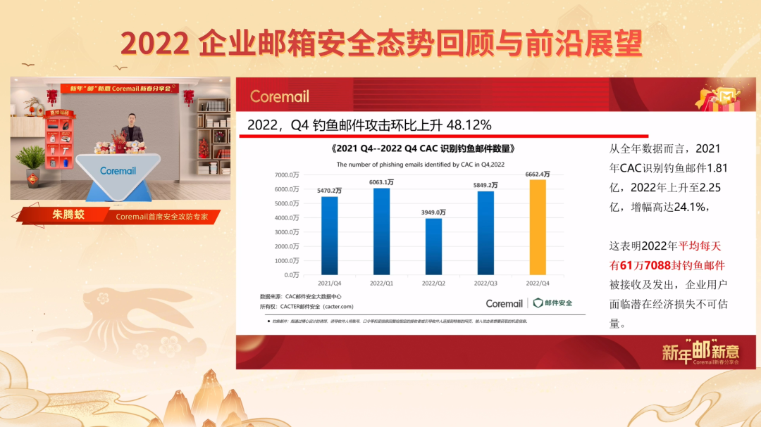 企業(yè)郵件安全問題不容忽視,Coremail首席安全攻防專家朱騰蛟用翔實(shí)的數(shù)據(jù)為大家展現(xiàn)了2022年度企業(yè)郵件遭遇的安全問題并提出應(yīng)對(duì)措施。