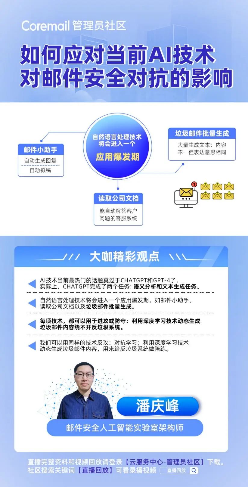 3月23日,Coremail郵件安全人工智能實(shí)驗(yàn)室首席架構(gòu)師潘慶峰(下文簡稱“大P”)在直播間進(jìn)行了深度分享,作為中國電子郵件元老級(jí)技術(shù)專家,20年以來長期深耕于智能算法在郵件安全領(lǐng)域的應(yīng)用實(shí)踐,從目前大火的AI熱潮中,他看到了哪些挑戰(zhàn)與機(jī)會(huì)呢?