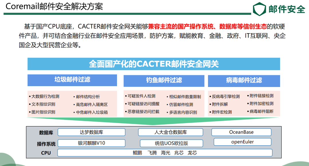 Coremail以郵件網(wǎng)關(guān)為核心推出綜合性郵件安全信創(chuàng)解決方案,依托神經(jīng)網(wǎng)絡(luò)平臺(tái) NERVE 1.0 惡意郵件檢測(cè)能力,結(jié)合自研國(guó)產(chǎn)反垃圾引擎,可實(shí)時(shí)攔截垃圾廣告、釣魚(yú)郵件、病毒郵件、BEC詐騙郵件,攔截有效率高達(dá)99.8%。目前,Coremail郵件安全網(wǎng)關(guān)先后與鯤鵬、飛騰、人大金倉(cāng)、麒麟等國(guó)產(chǎn)軟硬件產(chǎn)品相適配,高效構(gòu)建郵件系統(tǒng)防護(hù)墻,可為政府、金融、教育、央企、國(guó)企等關(guān)鍵基礎(chǔ)設(shè)施單位提供更加安全、高效、自主可控的信創(chuàng)解決方案。目前已落地上百個(gè)成熟案例,可無(wú)感知平滑替換梭子魚(yú)、趨勢(shì)科技、思科等國(guó)外品牌網(wǎng)關(guān),在識(shí)別有效率、產(chǎn)品易用性、綜合服務(wù)能力等方面均得到客戶(hù)認(rèn)可。