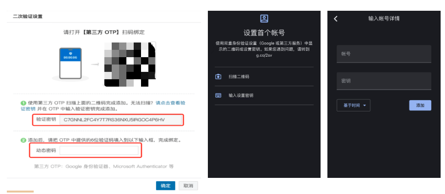 (2)先點擊查看驗證密鑰,打開第三方OTP,輸入驗證密鑰完成添加。
