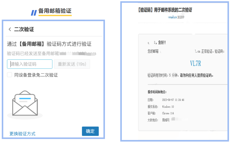 △登錄驗證時,選擇“備用郵箱”作為驗證方式。登錄備用郵箱并獲取驗證碼后,返回驗證界面輸入即完成驗證。