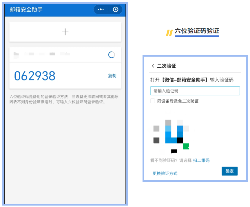△掃描或直接打開微信小程序“郵箱安全助手”查找對應(yīng)六位驗證碼后,在二次驗證碼欄里輸入即可。