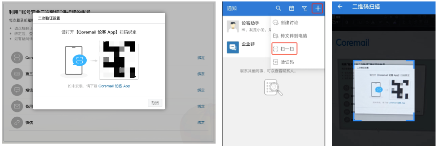 2)在webmail或Coremail郵箱客戶端軟件 V4.0及以上版本的二次驗證綁定頁,用App掃描二維碼即可完成綁定。