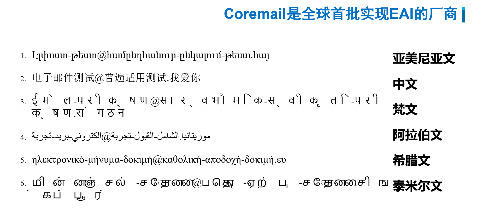 吳總表示,非洲地區(qū)一直以來是Coremail全球重點(diǎn)服務(wù)的市場之一,非洲文化多樣性極高,擁有大約2000種語言、多種宗教信仰和豐富的藝術(shù)形式。Coremail作為全球首批實(shí)現(xiàn)EAI的廠商,已經(jīng)推出了支持國際技術(shù)標(biāo)準(zhǔn)EAI的國際化多語種郵件軟件產(chǎn)品,支持電子郵件地址使用本地語言和文字。