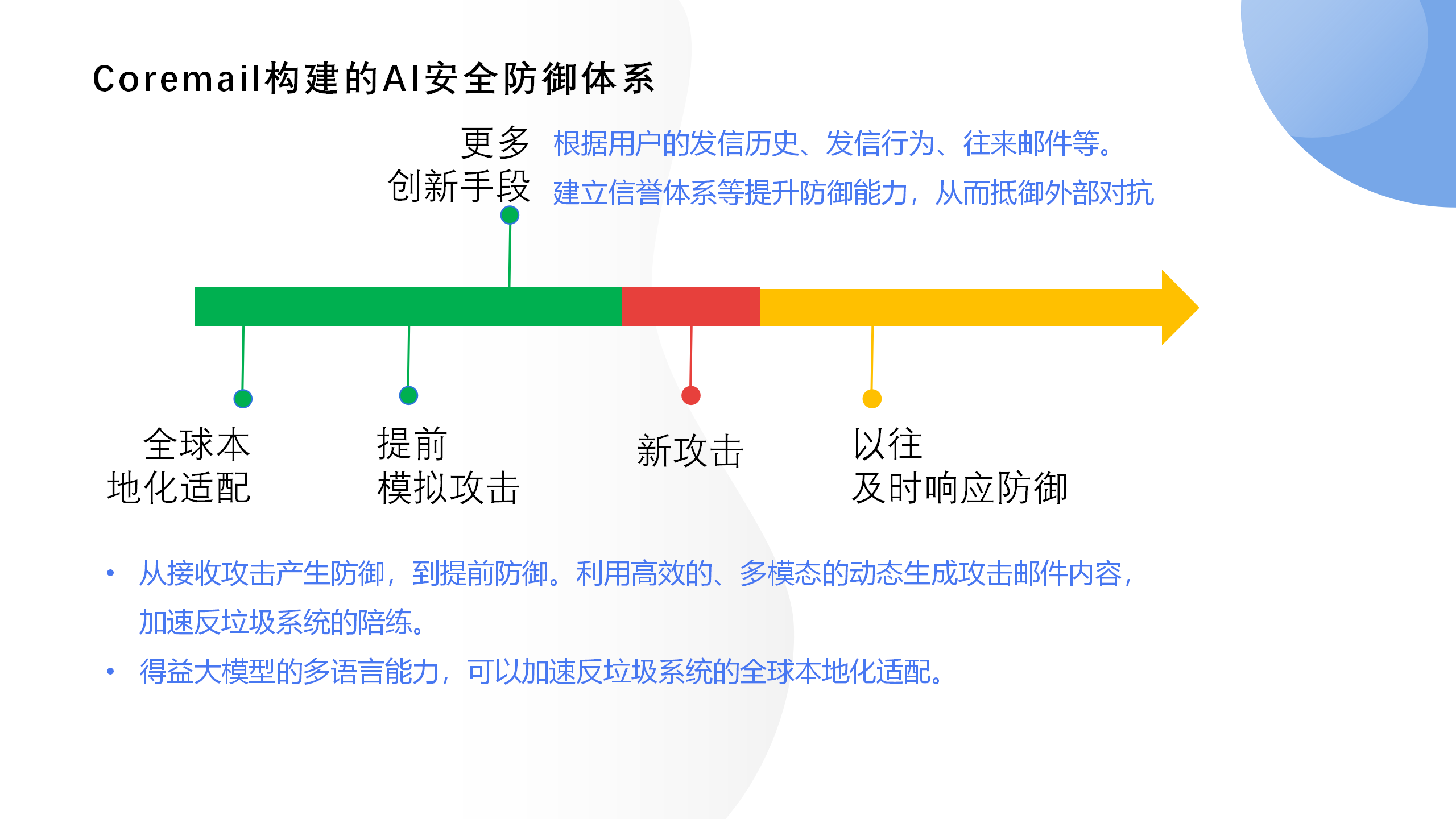 面對當前AI安全攻防的嚴重形勢,Coremail基于多年的郵件系統(tǒng)研發(fā)、服務經(jīng)驗,提供全面、多機制的保護策略,并構(gòu)建了AI安全防御體系。Coremail通過利用高效的、多模態(tài)的動態(tài)生成攻擊郵件內(nèi)容,加速反垃圾系統(tǒng)的陪練,做好提前防御;利用大模型的語言能力,加速反垃圾系統(tǒng)的全球本地化適配;根據(jù)用戶的發(fā)信歷史、行為和往來郵件等,建立信譽體系,提升防御能力。