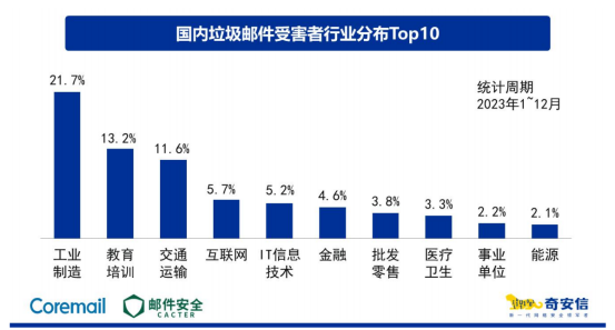 郵件安全向來是教育行業(yè)的一大痛點,由于教育行業(yè)的特殊性和重要性,國外勢力、黑產鏈條虎視眈眈,根據(jù)Coremail AI實驗室監(jiān)測分析,2023年度不論是收到的釣魚郵件數(shù)、垃圾郵件量,還是遭受到暴力破解攻擊的次數(shù),教育行業(yè)都居高不下。