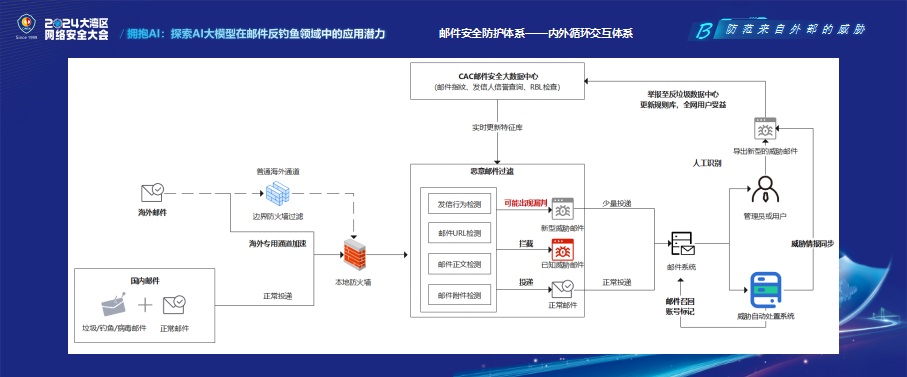 11月8日,網(wǎng)絡(luò)與數(shù)據(jù)安全分論壇開講,Coremail高級安全解決方案專家劉騫發(fā)表“擁抱AI:探索AI大模型在郵件反釣魚領(lǐng)域中的應(yīng)用潛力”主題演講,分享了Coremail在AI大模型融合郵件防護應(yīng)用的探索。