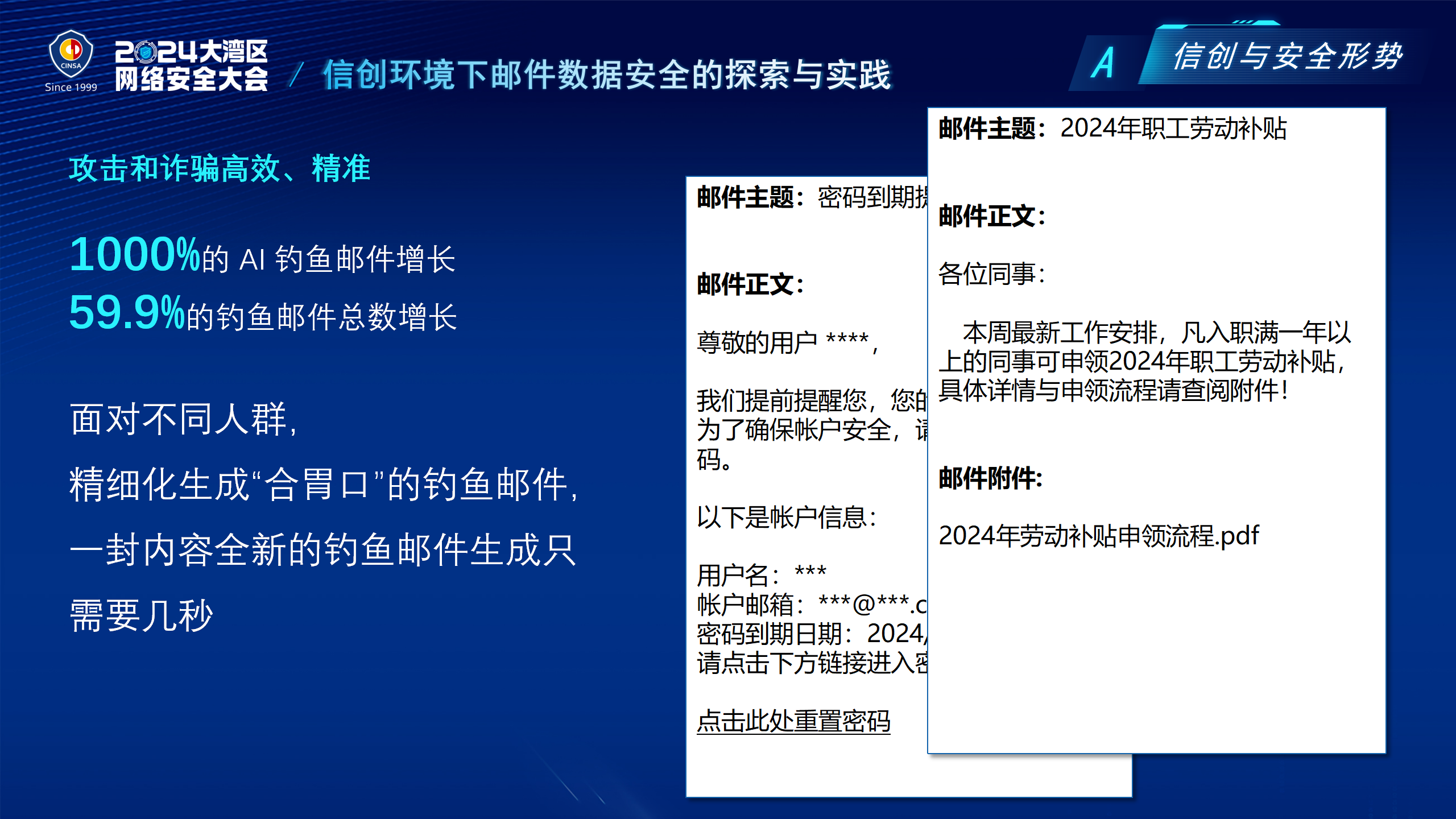 近年來,數(shù)據(jù)安全越來越被重視,而郵件系統(tǒng)承載著大量數(shù)據(jù)的內(nèi)外往來,是企業(yè)至關(guān)重要的基礎(chǔ)設(shè)施。據(jù)Coremail與奇安信聯(lián)合發(fā)布的《2023中國企業(yè)郵箱安全性研究報告》數(shù)據(jù)顯示,2023年國內(nèi)共收發(fā)各類電子郵件約7798.5億封,其中垃圾郵件占比54.2%。隨著AI技術(shù)的廣泛應(yīng)用,網(wǎng)絡(luò)安全問題更加多樣化,攻擊者正利用AI使釣魚郵件變得更加豐富和逼真,嚴重威脅數(shù)據(jù)安全。