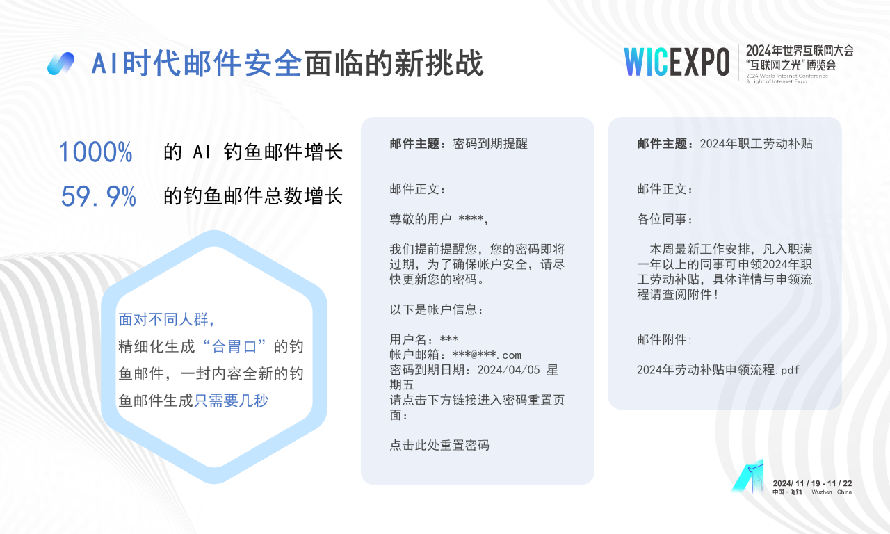 隨著人工智能等新技術(shù)的廣泛應(yīng)用,郵件安全問(wèn)題更加多樣化,攻擊手段更加復(fù)雜。數(shù)據(jù)顯示,2023年基于 AI 的攻擊和詐騙郵件增長(zhǎng)了1000%。在2024年第一季度中,企業(yè)郵件攻擊和詐騙郵件數(shù)量同比增長(zhǎng)59.9%。AI的應(yīng)用讓郵件辦公更智能、更高效。但同時(shí),黑產(chǎn)也在利用AI使釣魚(yú)郵件變得更加豐富和逼真,嚴(yán)重威脅數(shù)據(jù)安全。