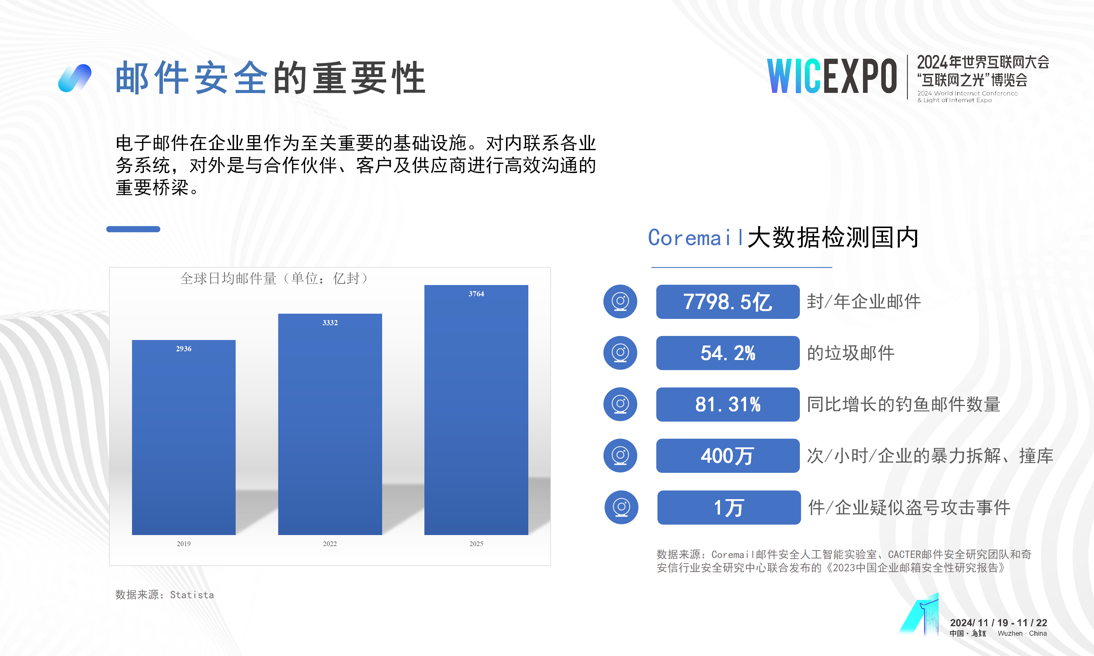 11月19-22日,2024年世界互聯(lián)網(wǎng)大會(huì)烏鎮(zhèn)峰會(huì)盛大舉辦,期間,“互聯(lián)網(wǎng)之光”博覽會(huì)“網(wǎng)絡(luò)安全”新產(chǎn)品新技術(shù)發(fā)布活動(dòng)在烏鎮(zhèn)互聯(lián)網(wǎng)國(guó)際會(huì)展中心紅亭發(fā)布區(qū)舉行,Coremail亮相發(fā)布現(xiàn)場(chǎng),展示郵箱與AI的探索實(shí)踐成果。