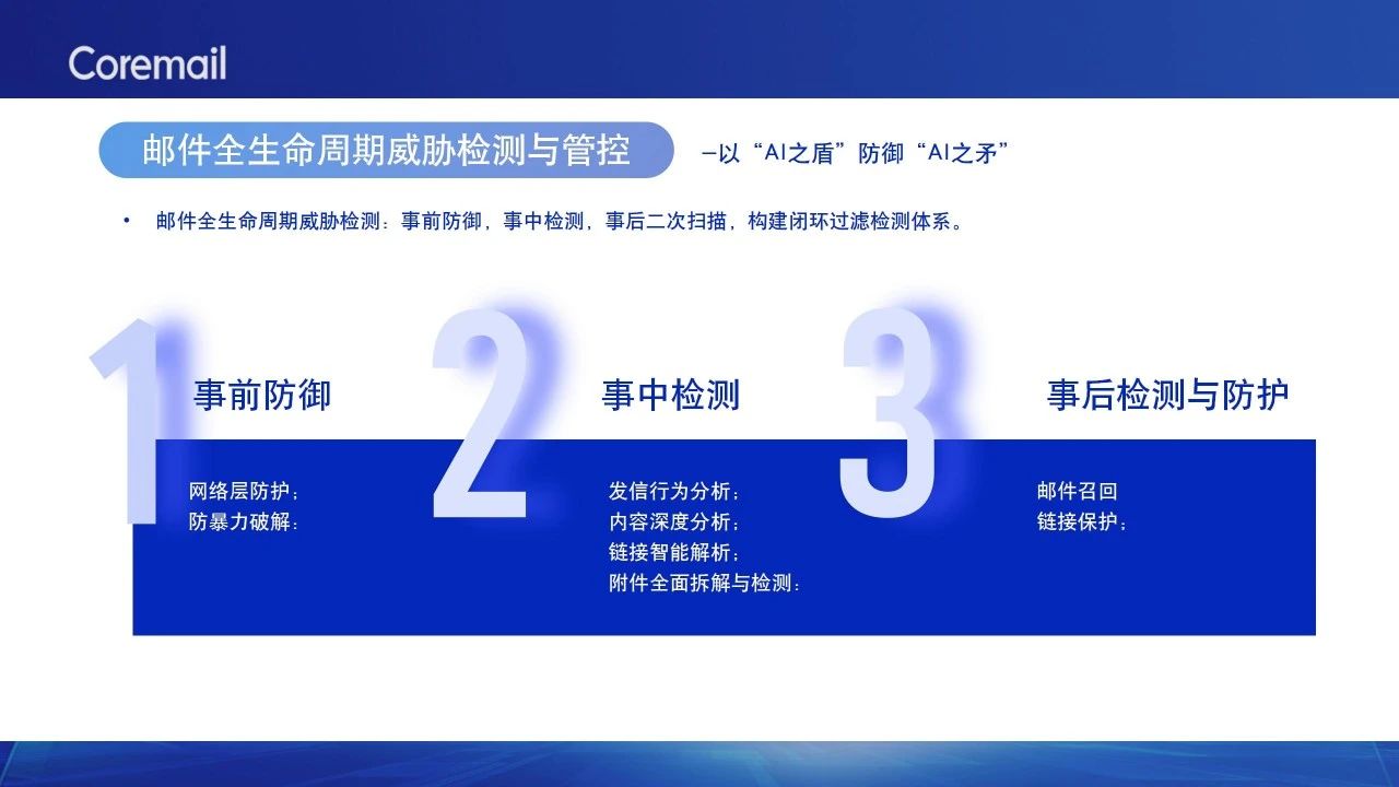 借助AI之力,CACTER大模型郵件安全網(wǎng)關(guān)對(duì)威脅郵件內(nèi)容進(jìn)行深度分析;提供動(dòng)態(tài)的URL檢測(cè)和防御能力,識(shí)別和阻止新型惡意URL的攻擊;幫助管理員對(duì)郵件統(tǒng)計(jì)數(shù)據(jù)進(jìn)行深度解讀并提供安全策略。通過事前防御、事中檢測(cè)、事后二次掃描,CACTER大模型郵件安全網(wǎng)關(guān)實(shí)現(xiàn)對(duì)郵件全生命周期威脅檢測(cè),結(jié)合人工智能技術(shù),構(gòu)建閉環(huán)過濾檢測(cè)體系。AI的崛起正為各行業(yè)帶來更多的新機(jī)遇,未來,Coremail也將不斷探索,持續(xù)投入AI新技術(shù)研發(fā),全力賦能各行業(yè)數(shù)字化提質(zhì)轉(zhuǎn)型!
