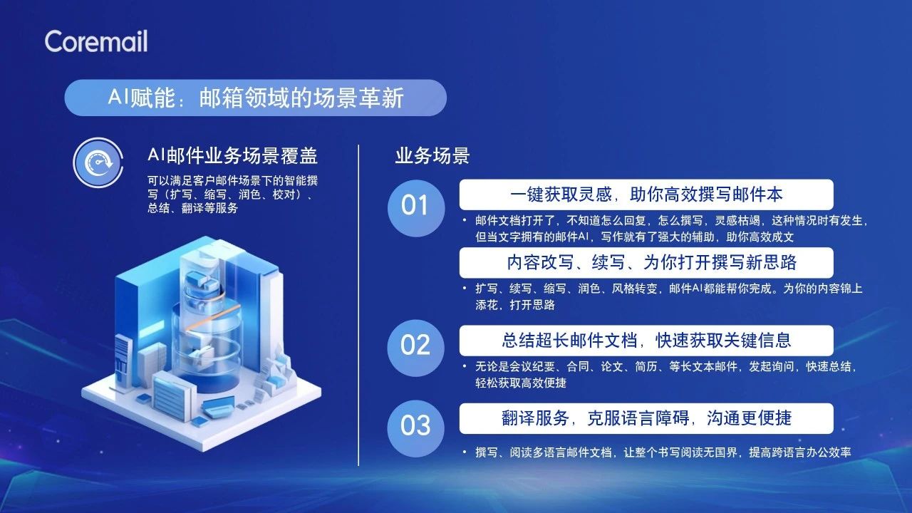 AI時(shí)代,Coremail積極投入AI+郵箱的創(chuàng)新融合,將郵箱能力解耦調(diào)用,Coremail大模型對(duì)接模塊整合數(shù)據(jù)資源,賦能郵箱,實(shí)現(xiàn)智能化和自動(dòng)化,落地功能涵蓋智能撰寫、文章潤(rùn)色、智能校對(duì)、郵件翻譯、智能總結(jié)等多個(gè)郵件辦公場(chǎng)景,全面提升郵件辦公效率。