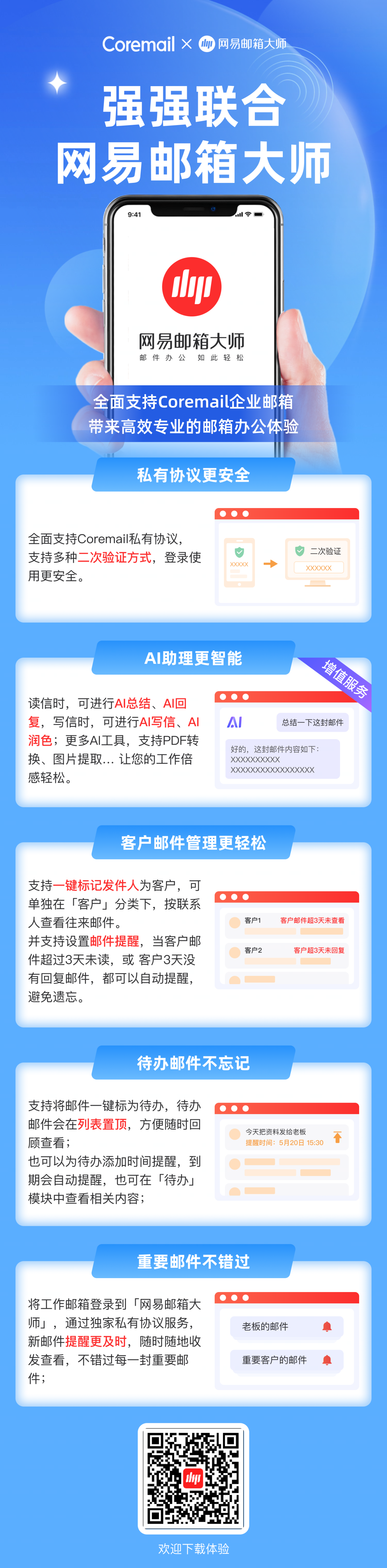 近日,Coremail企業(yè)郵箱與網(wǎng)易郵箱大師移動(dòng)端達(dá)成深度合作,雙方憑借創(chuàng)新融合模式,充分整合技術(shù)、功能及服務(wù)優(yōu)勢(shì),為企業(yè)郵箱用戶打造智能化、高效能的郵件管理新平臺(tái)。