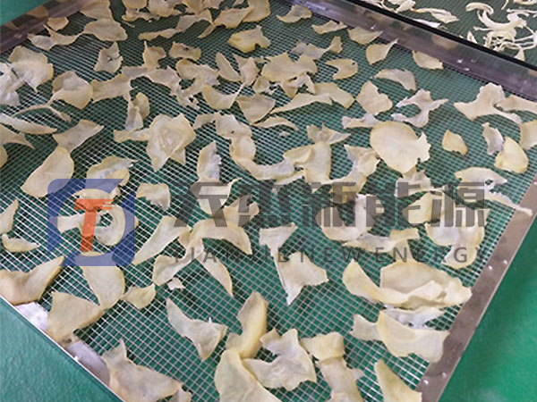 接下來(lái)是將土豆片分別放入托盤(pán)之中,放入土豆片烘干機(jī)進(jìn)行烘干,土豆片烘干用多少溫度合適?前期先用低溫定色,設(shè)置溫度40℃左右,再慢慢升溫,后期烘干溫度控制在60℃一70℃, 要求土豆片含水量為10%以下。