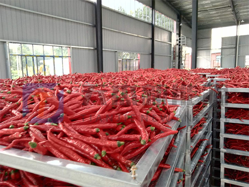 一、辣椒烘干房使用流程:用戶在使用辣椒烘干房烘干辣椒的時候,將辣椒均勻平鋪在托盤上,統(tǒng)一放置在小推車上的托盤架,然后推入烘干房準(zhǔn)備烘干,烘干房是采用箱式烘干結(jié)構(gòu),內(nèi)部有熱風(fēng)循環(huán)系統(tǒng)和自動溫、濕度控制系統(tǒng),可以對烘干房內(nèi)的物料烘干,溫度控制都可以很好的控制。