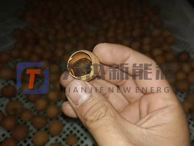 初烘:將龍眼均勻的攤放到龍眼桂圓烘干機(jī)推車上,初始溫度設(shè)定為55℃,烘干時(shí)間為8個(gè)小時(shí)左右,初烘完成的成品是外殼堅(jiān)硬,果肉呈黃褐色或赤褐色并帶油光,有細(xì)小皺紋,果核外皮易脫落,核仁淡白色。